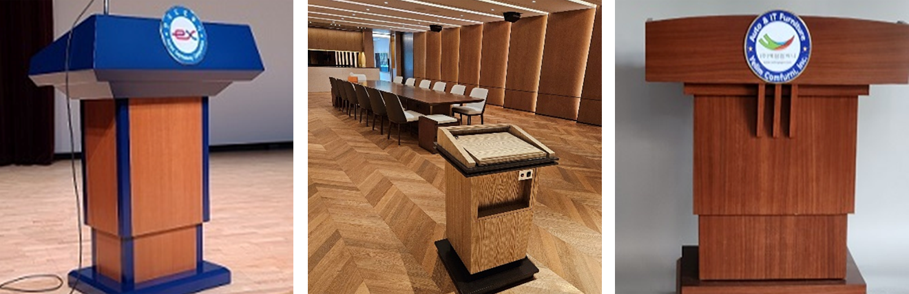 - 강연대는 스위치로 승하강 되는 강연대로 모델마다 제작사양은 다르며 천연무늬목 + 우레탄 도장 + 원고대 + 스위치+ 리프트 + 하부캐스타는 동일하며 우레탄도장 무늬목 등은 사양에 마춰 제작한다.